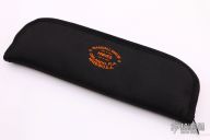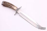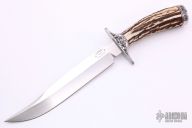 This fighter by Mike Sakmar has a hand rub satin finished blade with a false top edge, .190" blade stock and 1.279" blade depth, hidden tang construction. The handle has an engraved stainless guard and butt cap, stag grip and red/stainless steel spacers. Dated 1994. Comes with a zippered case. Excellent condition.