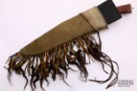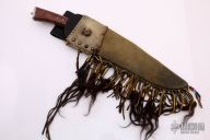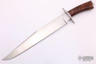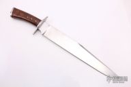 This Bowie by Master Smith Daniel Winkler features a satin finished blade with false top edge, .207" blade stock and 1.716" blade depth, hidden tang construction. The handle has a steel guard and butt with wood grip. Comes with a brown leather sheath with tassels and a zippered case. Has a few light scratches, otherwise excellent condition.