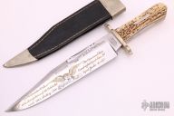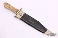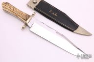 This Antique Bowie by George Wostenholm and Son features a mirror polished blade with false top edge and fileworked spine, .367" blade stock and 1.910" blade depth, full tang construction. The handle has a nickel silver guard, stag scales and nickel silver escutcheon. Comes with a nickel silver and black leather scabbard. Has some light scratches and oxidation, otherwise excellent condition for its age.