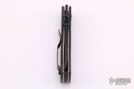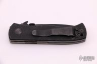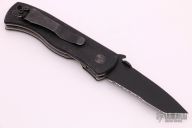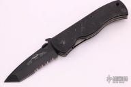 This Mini CQC-7BW by Emerson has a black coated partially serrated tanto blade and textured black G10 handle. Wave feature. Nice lockup, detent, and seating. Has a black tip up clip. Has some scuffs/scratches, otherwise good condition.