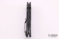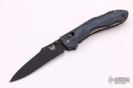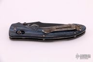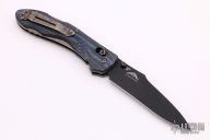 This 930BK Kulgera from Benchmade features a black recurve blade with swedge and dual thumbstuds. The handle is comprised of blue and black G10 scales over black steel liners and stand-offs. Stainless steel tip up clip is reversible for left or right hand carry. Has some scuffs and scratches, otherwise good condition.