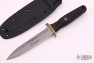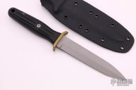 This version is smaller than the original and features a concave back blade. Based on an ancient Japanese spear design, this small and light boot knife is superior in penetration and slashing. When the retired Colonel Rex Applegate handed Boker the prints and design notes for the famous combat knife bearing his name and that of his partner, British Captain W.E. Fairbairn, Boker vowed to stay true to the genius of the original mode, stringently following the original design specifications, with allowances only for the latest in modern materials. The result is the perfect fusion of form and function: The Applegate-Fairbairn Fighting knife from Boker. Its history is compelling: During WWII, commando instructors Applegate and Fairbairn were both assigned to the OSS, the Office of Strategic Services, where they collaborated to improve the Fairbairn-Sykes commando knife, designed for serious hand to hand combat. Boker's reissue of the Applegate-Fairbairn Fighting knife uses the fiberglass-reinforced Delrin handle, thickened in the center for a sure grip. A lanyard hole adds convenience. The handle meets a short, forward bending cross guard that protects the fingers. Boker achieved the knife's preferred rearward balance by inserting lead weights into the handle--a beautifully ergonomic design. Struck of Solingen 440C stainless steel hardened to a Rockwell 58, the blade has the signatures of Rex Applegate and W.E. Fairbairn etched into the bead-blasted finish. Made in Germany. Comes with kydex sheath. Excellent condition. Has a "Besh Wedge" ground blade.
