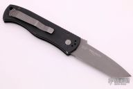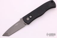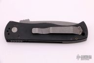 This Emerson/Pro-Tech CQC7 automatic has a chisel ground bead blast finish blade with a plain edge and a solid black aluminum handle. Bead blast stainless steel clip. Coil spring. Comes with original box, sheath and papers. Has scuffs, scratches, has been carried, fair condition. PR2 #71.