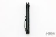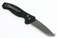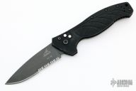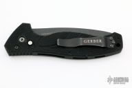 This Gerber Emerson Alliance tactical knife has a black finished 154-CM stainless steel partially serrated drop point blade. Handle is black anodized aluminum with milled scales and notched thumb rest, safety button, lanyard hole, and black stainless steel tip up clip. Has some scuffs and is missing half the pivot screw, otherwise fair condition. This was the first auto that Gerber ever made.