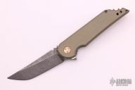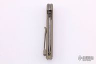 This MK Ultra flipper by Jake Hoback has a etched and tumbled AEB-L stainless steel upswept/tanto blade, notched thumb-rest and flipper. Caged bearing pivot. "Ps23 Hoback" stamped on rear of handle. Handle is comprised of black anodized aluminum with a matching pocket clip positioned for tip up carry, left or right reversible. Has a copper pivot and bead blasted screws. Nice detent, lockup, and blade seating. Knife flips well with absolutely no wrist action needed. Comes with leather pouch and pivot tool. Excellent condition.