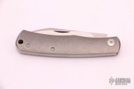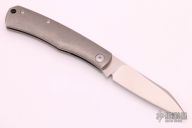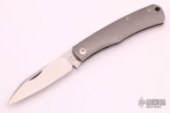 This Birdy Slipjoint by Sacha Thiel features a satin finished blade with nail nick. The handle has a tumbled titanium frame with titanium liners and a stainless steel spring. Has half stop, flush in all positions. Comes with original box, papers and leather slip sheath. Excellent condition.