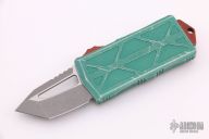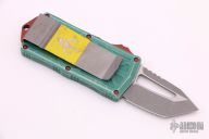 This Microtech Exocet features an apocalyptic finished tanto blade. The handle is comprised of a distressed green aluminum handle and a stainless clip that doubles as a money clip dated 01/2021 S/N 640. Comes with original box and papers. Excellent Condition.