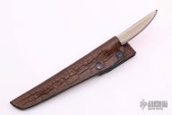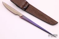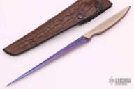 This Titanium Stiletto by PJ Ernest features an anodized titanium spear point blade with false top edge, .124" blade stock and .616" blade depth, full tang construction with tan G-10 scales. Comes with a brown leather covered kydex sheath with a belt loop. Comes with zippered case. Has some light scratches, otherwise excellent condition.