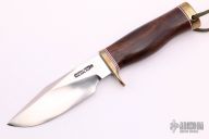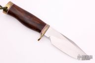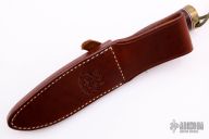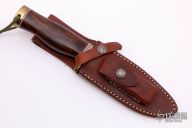 This Sergeant's Special by Randall Made Knife features a satin finished blade with sharpened top edge and a notched thumbrest, .213" blade stock and 1.394" blade depth, hidden tang construction. The handle has a brass guard and butt with a desert ironwood grip and red/white/blue spacers. Comes with a brown leather sheath and original papers. Excellent condition.