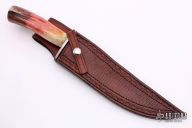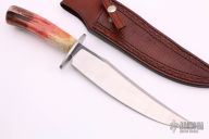 This Bowie by John Greco has a satin finished blade with false top edge, .207" blade stock and 1.702" blade depth, hidden tang construction. The handle has a steel guard, and stag grip with an aluminum pin. Comes with a brown leather sheath. Has some light scratches, otherwise excellent condition. Has 8670 blade steel. Has logo on the guard.