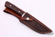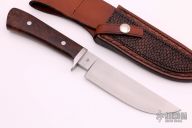 This Hunter by Journeyman Smith Sam Butler features a hand rub satin finished blade with .219" blade stock and 1.370" blade depth, hidden tang construction. The handle has a satin finished stainless steel guard, desert ironwood burl grip. Comes with a brown leather sheath with belt loop made by Schrap Leather. Has a few light scratches, otherwise excellent condition.