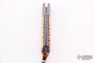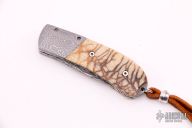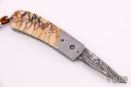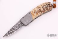 This Bolster Release Auto by Mike Whiskers Allen features a Devon Thomas "Random Pattern" Damascus blade with fileworked spine. The handle has Devon Thomas "Spirograph" Damascus dovetailed bolsters, tiger coral scales with black liners, fileworked stainless steel liners and backspacer. "08 W 02" inside backspacer. Nice action, lockup and blade seating. Comes with zippered case and COA, excellent condition.