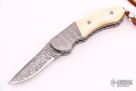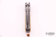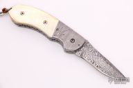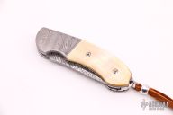 This Bolster Release Auto by Mike Whiskers Allen features a Damascus blade. The handle has Chad Nichols "Constitution" Damascus dovetailed bolsters, gold lip pearl scales with black liners, fileworked stainless steel liners and backspacer. "Whiskers 01-'09" inside backspacer. Nice action, lockup and blade seating. Comes with zippered case and COA, excellent condition.