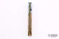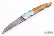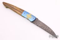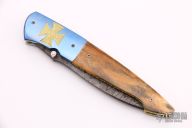 This Linerlock by Kanaka Tech (George Gibo and Carl Zakabi) features a wharncliffe Damascus blade with single thumbstud that has a diamond inlay. The handle has dovetailed carved and anodized titanium bolsters, bone scales, fileworked and anodized titanium liners, anodized titanium backsapcer with red/white/blue stone inlays. Nice detent, lockup, action and blade seating. Comes with a zippered case. Excellent condition.