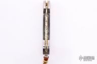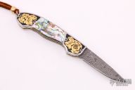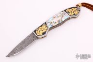 This Bolster Release Auto by Mike Whiskers Allen features a Devon Thomas "Bubble Wrap" Damascus blade. The handle has gold plated and engraved dovetailed stainless steel bolsters, abalone scales with black liners, fileworked and gold plated stainless steel liners and a fileworked stainless steel backspacer. "Whiskers 12-'06" inside backspacer. Nice action, lockup and blade seating. Comes with zippered case and COA, excellent condition.