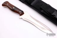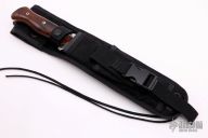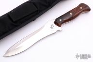 This Sniper from Mercworx features a hand rub satin finished drop point, recurved blade with sharpened top edge and notched thumb ramp, .241" blade stock and 2" blade depth, full tang construction. The handle is comprised of desert ironwood burl scales with mosaic pins and red liners. Excellent condition. Comes with original nylon sheath