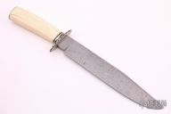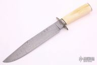 This Bowie by Dennis Riley features a Damascus blade with a false top edge, .279" blade thickness and 1.566" blade depth, hidden tang construction. The handle has fileworked nickel silver guard and butt plate with a walrus ivory grip. Has some cracks in the handle, otherwise good condition.