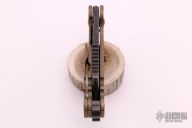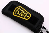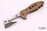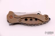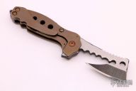 This Small Ratchet flipper by RichMade Knives features a tumbled blade with notched thumbrest and a flipper. The handle is comprised of anodized titanium with tip up clip over a D2 backspacer. Nice blade seating, detent and lock up. Rides on bearings. Excellent condition. Comes with zippered case and COA.