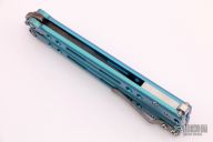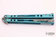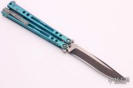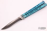 This Specter Balisong from Jerry Hom features a two-tone finished recurve blade with swedge. The handle is comprised of anodized titanium handles with satin titanium backspacers and T latch. Includes original box. Excellent condition.