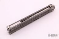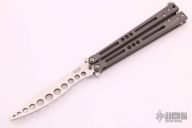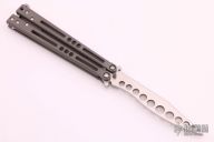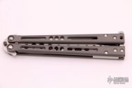 This Prodigy Trainer Balisong from Jerry Hom features a satin finished recurve blade with hole pattern. The handle is comprised of bead blasted titanium handles with satin titanium backspacers and T latch. Includes original box and papers. Excellent condition.