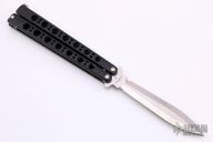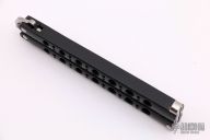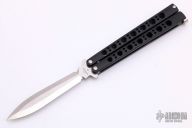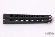 This Model 46 Bali-Song Prototype by Benchmade has a dagger blade with false top edge. Has black coated titanium handles with T-latch. Comes with original sheath. Excellent condition.
