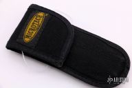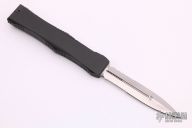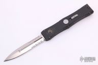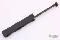 This Nemesis OTF automatic by Microtech opens via the automatic push button. Closes by disengaging the leaf lock and pulling the reverse charging handle in the rear of the frame. Contoured frame grip with milled ribbing on the frame spine and belly. S/N 970 and dated 4/99. Brend hand rub satin finished double edged partially serrated blade. Comes with original sheath. Excellent condition.