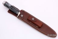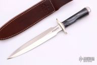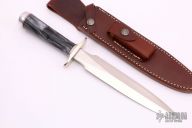 The Model 2-8 by Randall Made Knives is a heavily made dagger or dirk. Nickel silver guard, acrylic grip, duralumin butt cap, red and duralumin spacers. Double edged satin finished blade, .232" blade stock and 1.255" blade depth, hidden tang construction. Comes with a brown leather sheath. Excellent condition.