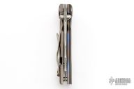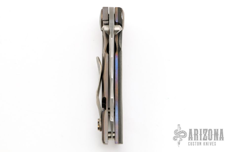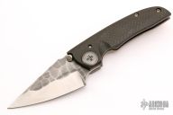This Thuck by John Gray Knives features a hollow ground blade with textured flats and spine, dual thumb studs. The handle has a carbon fiber front scale, anodized and textured titanium liner and lockside with matching tip up clip. Nice detent, lockup and blade seating. Has some scratches, otherwise good condition.