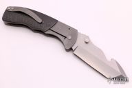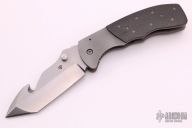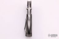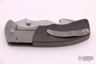 This Thick Folder by Aaron Frederick features a tumble finished tanto with gut hook, fileworked thumbrest and dual thumbstuds, .261" blade stock. The handle has bead blast titanium liners, lightning strike carbon fiber scale, copper pins, blasted titanium backspacer, and tip up bead blast titanium clip. Nice detent, lockup and blade seating. Has some scuffs and scratches, otherwise good condition.