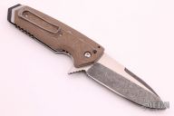 This Elishewitz design flipper by Hogue Knives features a stonewashed spear point blade. The handle has grey/tan G-10 scales with safety. Has stainless steel liners and pocket clip. Has a few light scuffs, otherwise excellent condition.
