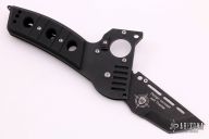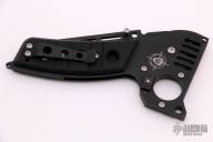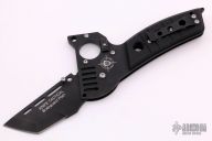This custom manufactured knife, which has the appearance of a firearm, is designed by Jeff Thenier who has been training bodyguards for 20 years It is also an effective and useful knife/tool for GI, S.W.A.T, security guards, bodyguards, martial arts, and self defense trainers. Comes with a sleek black finish, tanto blade thumb stud and stainless pocket clip. Features a black finish stainless gun shaped framed with finger hole and textured black G-10 handles. The knife can be held in the hand like a kuboton and in various positions which allows the user to use the knife as a self-defense tool (as shown on enclosed information sheet). In the closed position, the pointed edges can be used to effectively strike an assailant and deliver devastating blows to disable your opponent. The knife features two blade lock positions which allows the user to swing the knife in a variety of self-defense moves. It can also be used by fireman and mountain climbers as it features an integrated snap link to cut, fix or attach a rope if needed The thumb hole also allows for a steady, firm grip on the knife when control and power are needed. Comes with green trainer, original papers and tools. Has some scuffs, otherwise good condition.