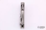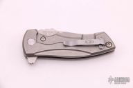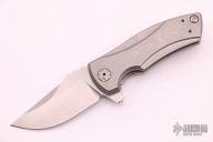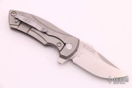 This knife by Zero Tolerance is a collaboration with Les George. Features a tumble finished blade with notched thumbrest and flipper. The handle has a tumble finished titanium frame with holes for a tip up reversible clip, no clip, single black barrel spacer. Stainless steel lockbar insert and integral overtravel stop. #1924. Has been resharpened, very well, otherwise excellent condition. Comes with original box and papers.