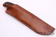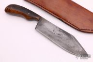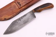 This Bowie by JJ Knives features a hand forged blade with false top edge and hamon, differential heat treat, notched thumbrest, .226" blade stock and 1.858" blade depth, full tang construction. The handle has burned oak scales with texture and copper pins. Comes with a brown leather sheath. New from maker with handwritten materials card.