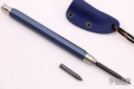 This spike pen features a black oxide finished spike that is deployed by pressing the button at the rear of the pen. This pen has been internally modified to accept and eject the spike with the push of the rear button. A piece of pencil graphite is positioned at the tip to conceal the spike. Works as a functioning pencil. New from maker. Very cleaver. Comes with a kydex neck sheath.
