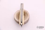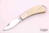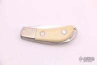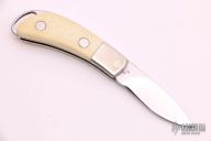 This Slip Joint by J.S Diana features a mirror finished drop point blade with a single nail nick. The handle has nickel silver bolsters, walrus ivory covers with coin edged nickel silver liners, stainless steel spring.  There is a female lion scrimshawed on the front cover.  Includes a padded zippered case.  Light scuffs and scratches are visible on the knife otherwise the knife is in good condition.  The spring is very strong.
