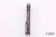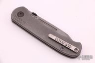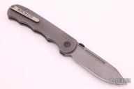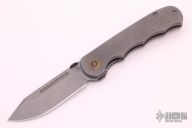 This Gooseworks Folder by Resco Instruments features a tumbled blade with fullers and thumbdisc. The handle has a tumbled titanium frame, stainless steel nested liner, tip up titanium clip. Has some scuffs and scratches, otherwise good condition.