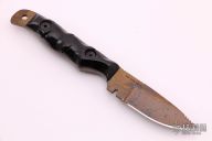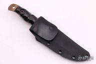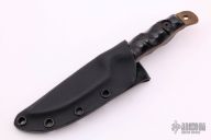This Handyman by Dawson Knives features an "Arizona Copper" blade finished with notched thumbrest, .149" blade stock and .916" blade depth, full tang construction with sculpted marble carbon fiber scales. Comes with a kydex sheath, original box and COA. Excellent condition.