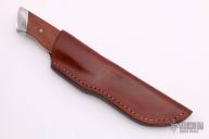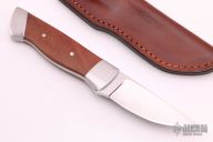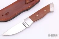 This drop point hunter by Ken McFall had a mirror polished drop point blade with a tapered tang construction.  .197" Blade Stock.  1.138" Blade Depth.  The handle has dovetailed stainless steel bolsters and wood scales with mosaic pins. Comes with brown leather sheath and a padded zippered case. Excellent Condition.