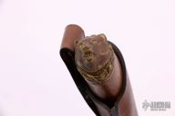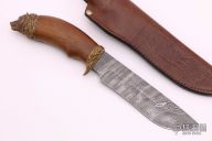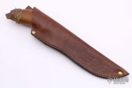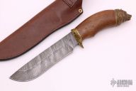 This Bear Hunter Knife (makers mark looks like a C with a P inside of it, please let us know if you know who this maker is) features a Damascus blade with .128" blade stock and 1.426" blade depth, hidden tang construction. The handle has a brass guard and butt with wood grip. Comes with a hand tooled brown leather sheath. Excellent condition. Made in St. Petersburg Russia.
