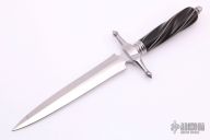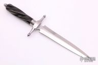 This dagger by Barry Dawson features a mirror finished double-edged blade, .193" blade stock and 1.154" blade depth, hidden tang construction. The handle has a stainless steel guard, butt and spacer with a spiral fluted wood grip with twisted silver wire inlays. Excellent condition.