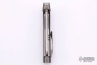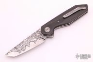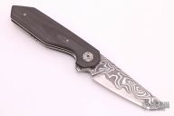 This left-handed Laterus flipper from Larevo Knives (Jason Overall) features a Nichols Low Layer XHP Core Damascus blade with notched thumbrest and flipper. The handle has carbon fiber scales and titanium liners.  The tip up pocket clip, backspacer and pivot collars are Damascus.  Nice detent, lock up and blade seating.  Light scratches are visible on the handle and blade otherwise the knife is in excellent condition.