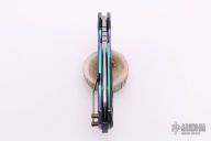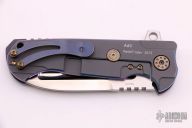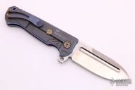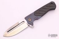 This Custom Pathfinder framelock flipper by Andre De Villiers has a satin finished blade with notched flipper and thumbrest. Handle has a bead blasted and anodized titanium frame, lightning strike carbon fiber scale, anodized and tumble finished titanium backspacer and tip up clip. Has stainless steel lockbar insert and lockbar stabilizer, anodized titanium screws and pivot. Nice smooth action, detent, lockup and blade seating. Comes with a nylon zippered case. Excellent condition. Dated 2015.