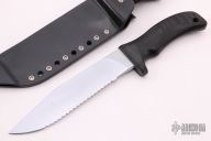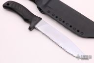 This DSU II by MadDog knives features a hard chromed blade, .251" stock. 1.435" blade depth, 3/4 serrated blade, hidden tang construction. Selectively tempered, the DSU 2 has Rockwell C-scale hardness of 62 at the edge (as hard as a file), and HRC 50-54 throughout the spine and hidden full tang. The black G-10 handle is designed to be ergonomic and has the ability to withstand tremendous punishment with little or no damage. It is hard and tough enough to be used as an impact tool. Includes a Kydex sheath. Some scratches on the blade, has been used, otherwise good condition. IMPOSSIBLE TO FIND.
