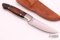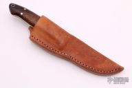 This Semi-Skinner by Gordon Romeis features a satin finished blade with .166" blade depth and 1.021" blade depth, full tapered tang construction. The handle has stainless steel bolsters, desert ironwood scales and a lanyard hole. Comes with a brown leather sheath. Has a couple light scratches, otherwise excellent condition.