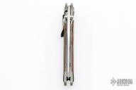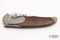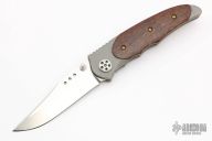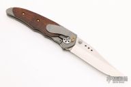 This knife by Allen Elishewitz and Howard Viele features a hand rub satin finished blade with dual thumbstuds. The handle has a bead blasted titanium frame with desert ironwood inlays, tip down bead blasted titanium clip, gold plated screws. #006. Comes with original sheath. Excellent condition.