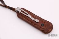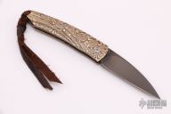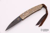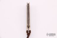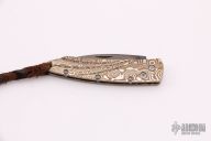 This side opening auto features a mokume handle. The blade features a DLC coated blade with a single nail nick. Push button with sapphire stone inlay. Fast action and strong lock up. Includes original box, paperwork and leather sheath. Excellent Condition.