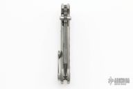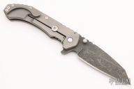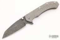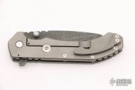 This Custom Hoplite by Aegis Knife Works features a stonewashed blade with dual thumbstuds, notched thumbrest and flipper. The handle has a stonewashed titanium frame with matching tip up clip and polished titanium barrel spacers. Nice detent, lockup and blade seating. Excellent condition.