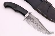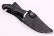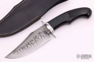 This Knife by Jan Hafinec is beautiful. It features a clip point blade (C105 Carbon Steel) with amazing hamon and sharpened top edge, .228" blade stock and 1.705" blade depth, hidden tang construction. The handle has a stainless steel guard with a nicely sculpted black G-10 grip. Comes with a nice black leather sheath. New from maker.