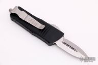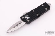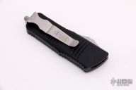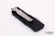 This Troodon Mini OTF automatic by Microtech knives features a stonewash finished double edged blade, and a black aluminum handle with bead blasted hardware, tip down carry. Glass breaker. S/N 1590. Dated 03/2021. Comes with original box and papers. Excellent condition.