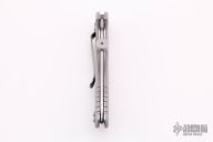 This XM Slippy by Hinderer features a stonewash finished spanto blade with removable thumbdisc. The handle has grey G-10 scales, tumbled titanium liners, stainless steel spring, lanyard hole, tip up or down reversible titanium clip. Comes with original box and papers. Excellent condition.